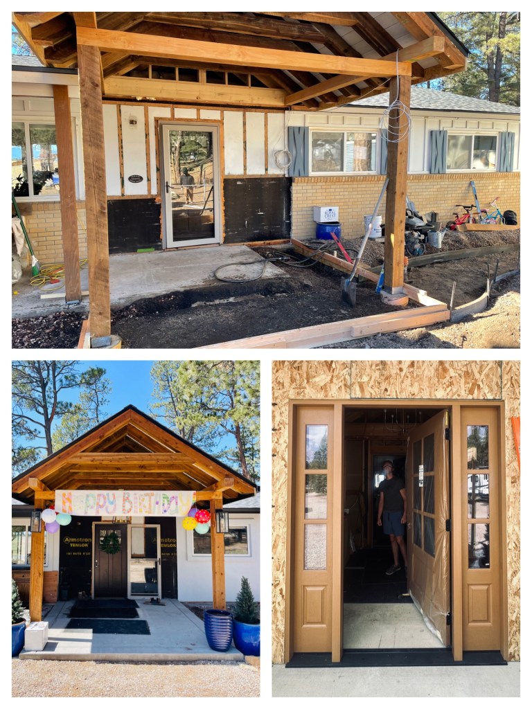 So many variations of our front entry have continuously evolved over the years. Until recently, our added on covered front porch began its transformation to an official grand entryway!